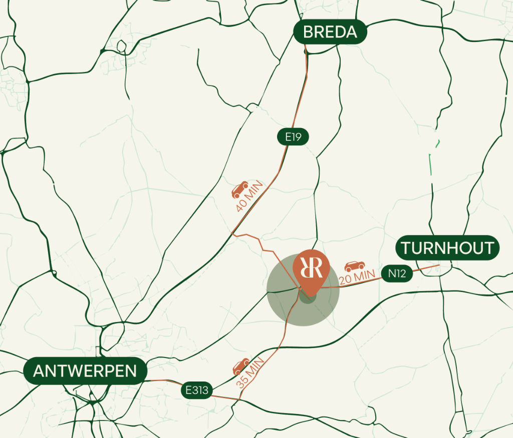 Renessehof ligt in Oostmalle, een charmant dorp dat rust en authenticiteit ademt. Tegelijkertijd geniet je hier van een centrale ligging: Turnhout, Breda en Antwerpen zijn eenvoudig bereikbaar, en de nabijheid van de grote autostrades brengt je snel naar alle belangrijke bestemmingen in de regio.